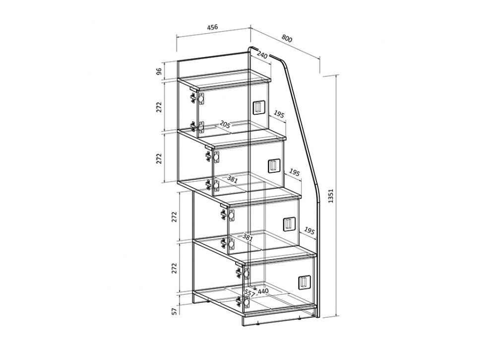 Угловая лестница-стеллаж состоит из четырех ступенек, надёжна и безопасна. В комплект входят фасады, поэтому стеллаж состоит из четырёх полноценных полок с дверками - удобное дополнительное место для хранения вещей.