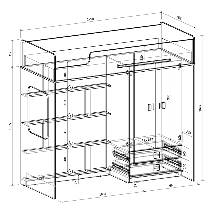 Под спальным местом располагаются два вместительных шкафа и стеллаж между ними для хранения одежды, белья, игрушек или иных вещей.